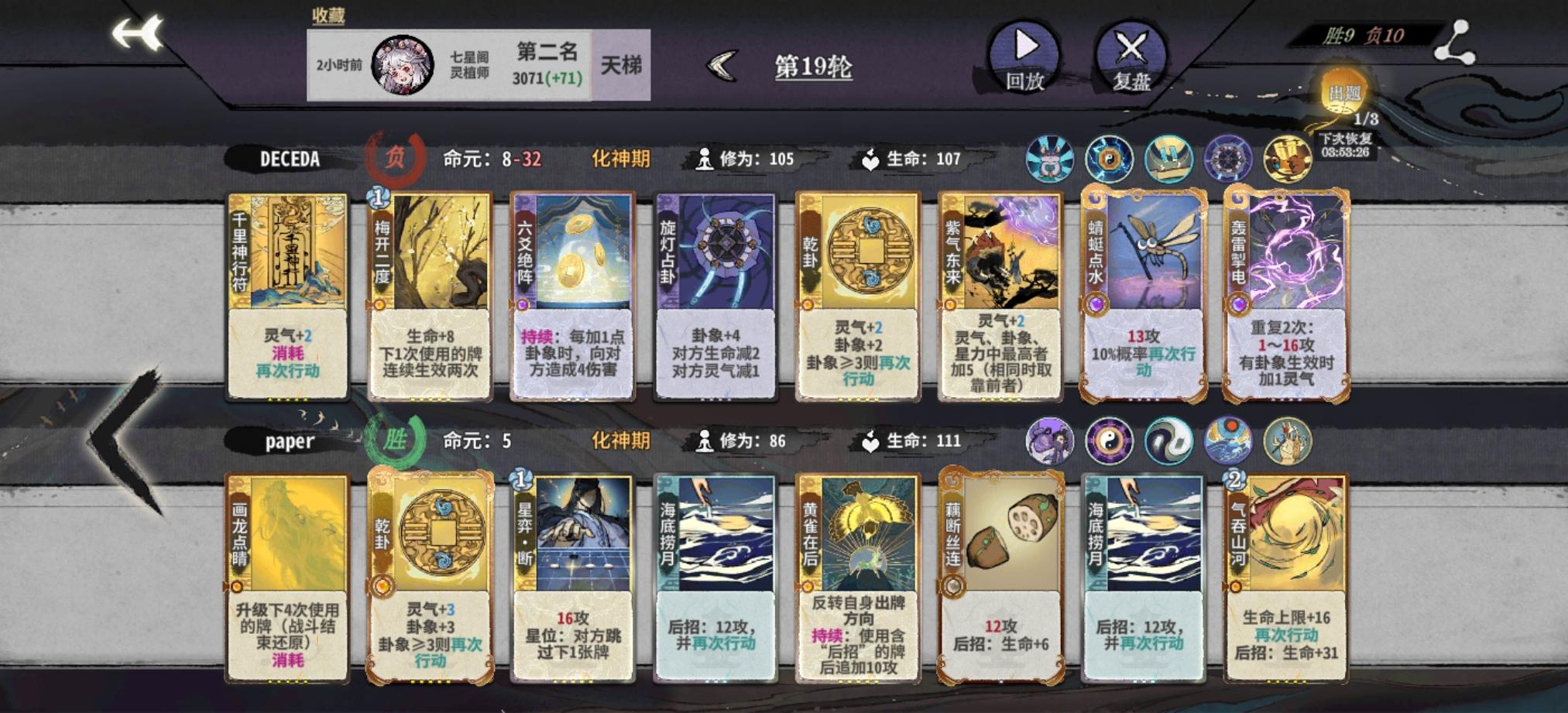 从弈仙牌Steam上线开始玩,断断续续的玩到今日。我强烈建议官方能做个非对战聊天室,或者搞个什么宗派聊天室之类的玩意儿。本来游戏就比较小众,不搞点聊天室真的太冷清了,我都不知道我这些年是咋挺过来的。话说对战聊天室打十把有人点开过一把吗?