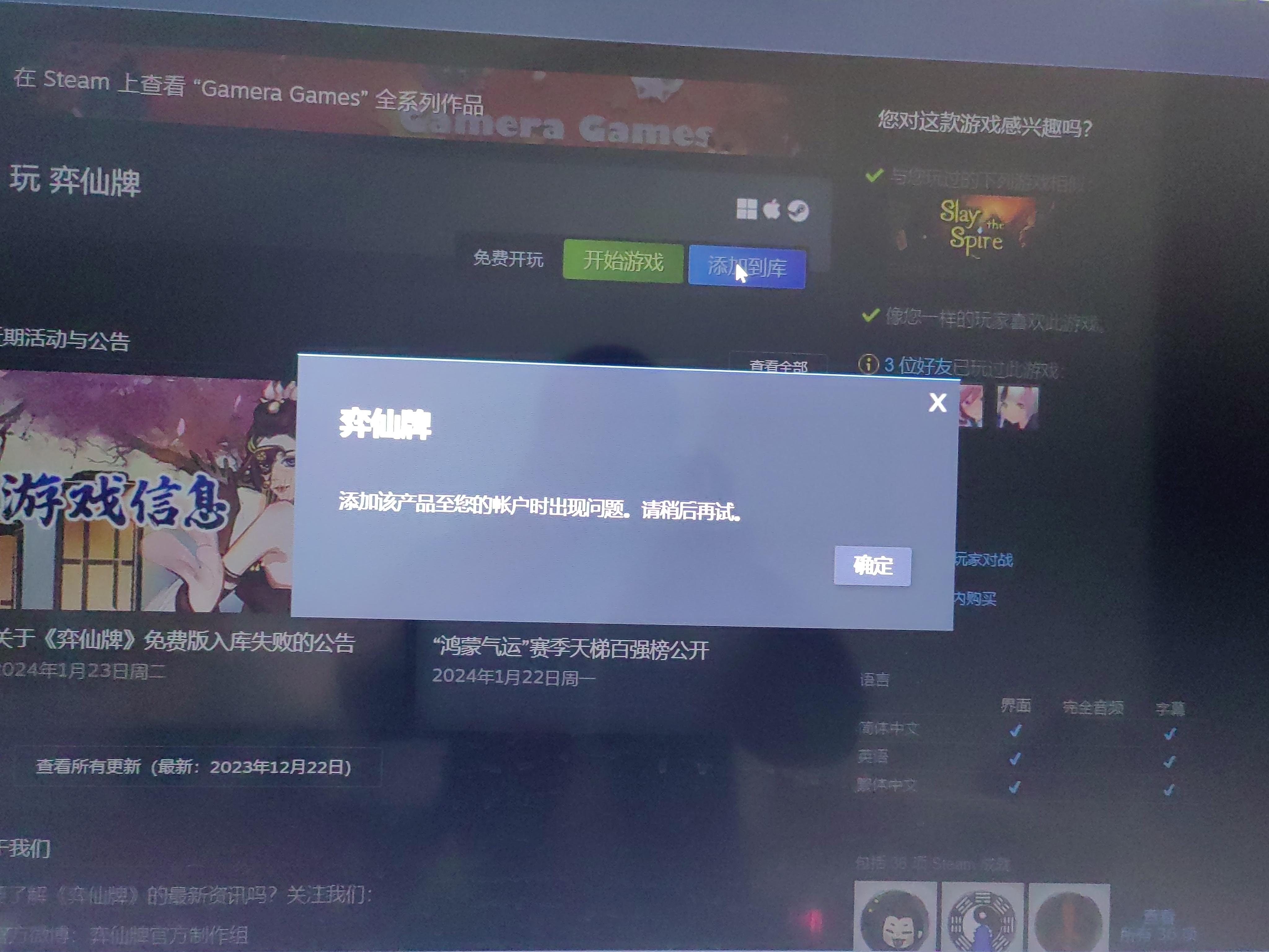 奕仙牌官方你们好,你们内测的时候朋友给我推荐这个游戏,后来我一直通过steam家庭共享游玩,昨天游戏还可以正常打开,但是刚刚发现steam版本打不开了。点打开游戏会显示无许可,入库会显示出现问题,请帮忙看看什么情况。