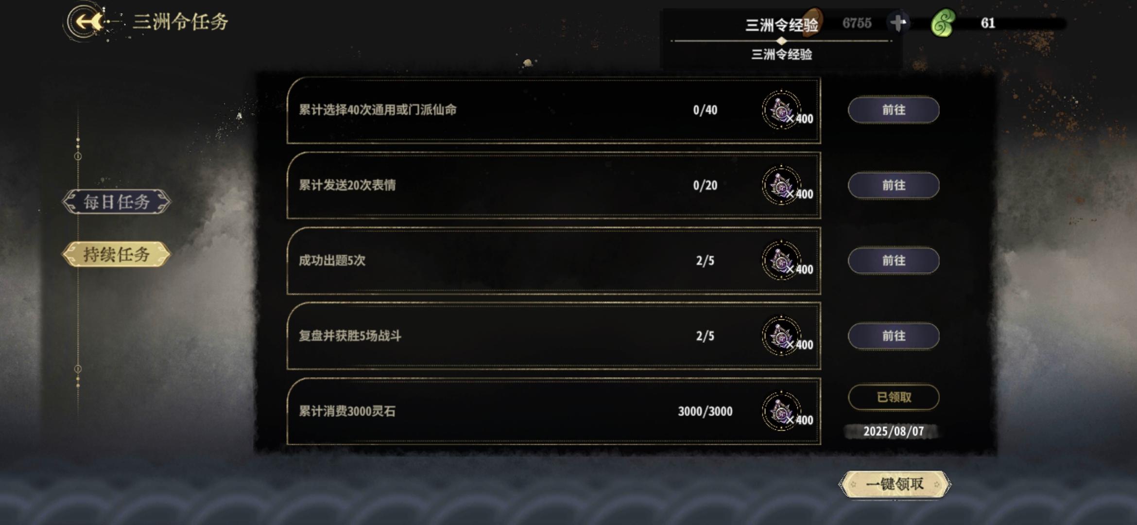 三洲令任务完成后不涨经验值。#弈仙牌