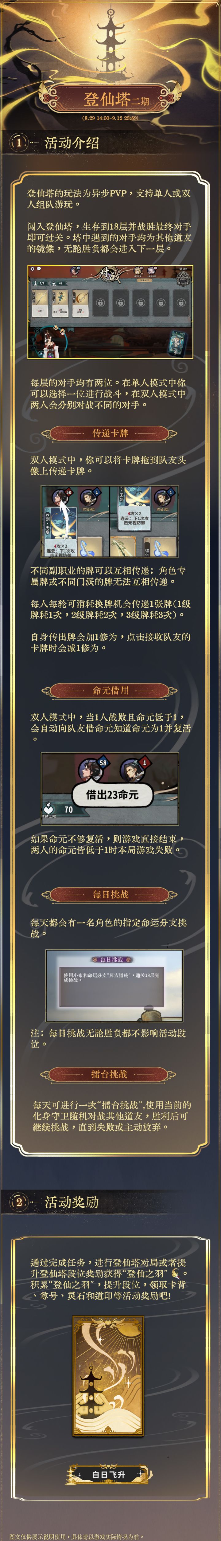 道友们好,我们计划在8月29日14:00进行不停服更新。请大家及时留意,避免影响对局。如果在更新后遇到问题,可以加入反馈群601804734和管理员联系。1.登仙塔活动限时开启推荐双人组队进行游戏(也可支持单人)。累计积分道具“登仙之羽”可领取卡背、尊号、衣着试用、彩墨绘卷等奖励。本期登仙塔相较上一期新增了每日挑战和化身守卫擂台挑战两个玩法,各位道友可在游戏内进行尝试。 2.仙市上新(1