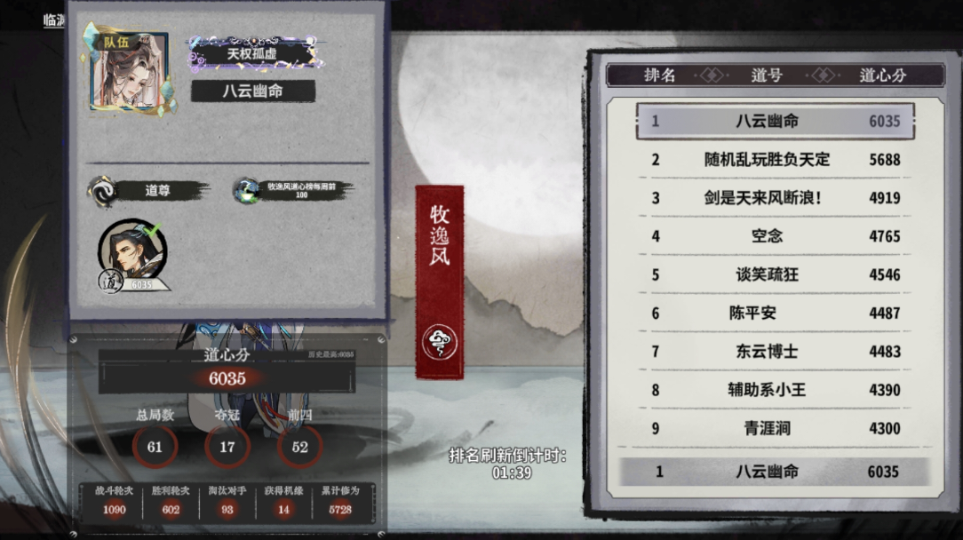 1.前言大家好,我是菜鸟玩家红尘有影,上个赛季吾行之道心榜排名第三,非常喜欢五行道盟的角色,经常研究各种五行角色的套路和卡组。因织梦赛季外面七星阁和剑宗肆虐,小弟在天梯被打得道心破碎,先有老鼠大人修为快如一匹马,小弟望尘莫及被一脚踢死,后有各种剑宗大人,剑意几刀砍小弟宛如砍瓜切菜,甚至还有七星阁各种仙女老登,小弟拼经全力也无法战胜,每当小弟卡组成形的时候,一首天音困仙区,天涯何处觅知音,小弟无奈