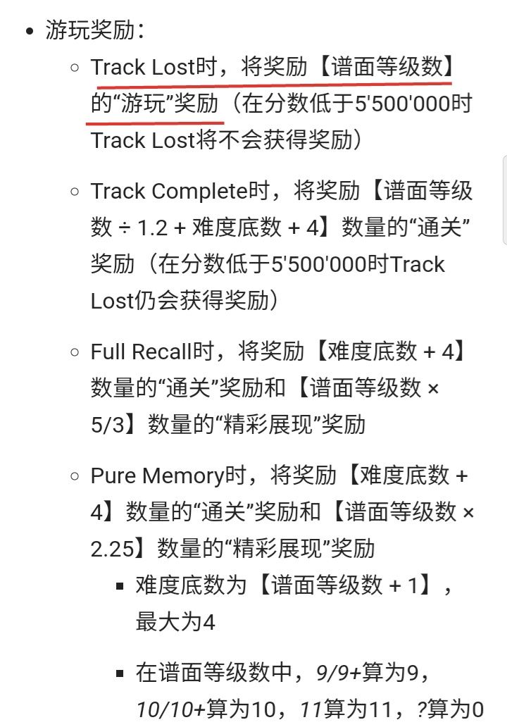 日常水水•卡体力小攻略有的人总是为了世界模式中间那个+2/4/6体力而不择手段(比如说我),所以研究了一下先要了解单曲ptt的计算规则分数大于9'800'000时ptt=ptt_0+1+(score-9'800'000)/200'000分数小于等于9'800'000时ptt=ptt_0+(score-9'500'000)/300'000其中ptt_0指谱面定数然后就是世界模式基础s