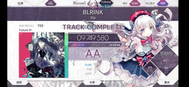 打暴风雨进解byd或猫对立***的时候要求残片最后两位相同,这除了0或者9999其他的都得看运气,但有一种特殊方法可以仅仅打一首曲子就使残片后两位相同。原理看到打红线那一句,该懂的人都懂了(((也就是说,只要挑选1~10级合适的曲子打到5500000分以上之后TL,就可以获得对应等级数的残片,至于搭档的残片加成,可以考虑用frag刚好50或者锁技能排除,这样就可以使残片稳定加1~10,可以实