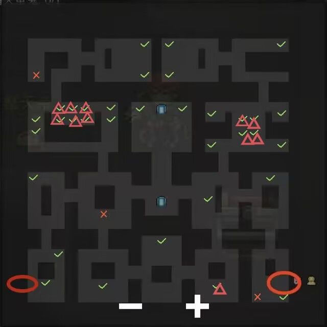 画圈的是隐藏房。打叉和画三角的都是陷阱箱。二层左上六个和右上四个宝箱会出宝箱怪,低概率掉宝宝蛋(金的更低,因为蓝的我都没见到多少)