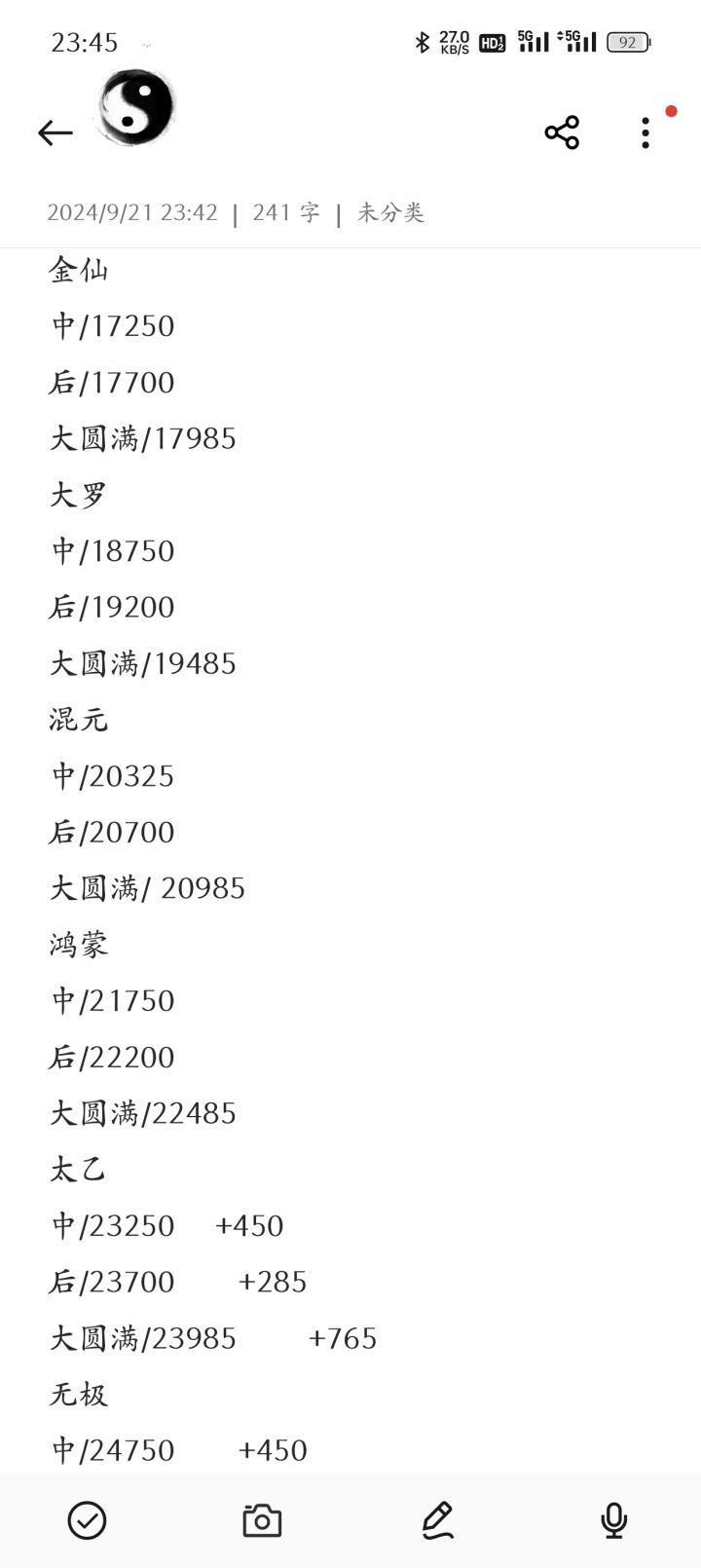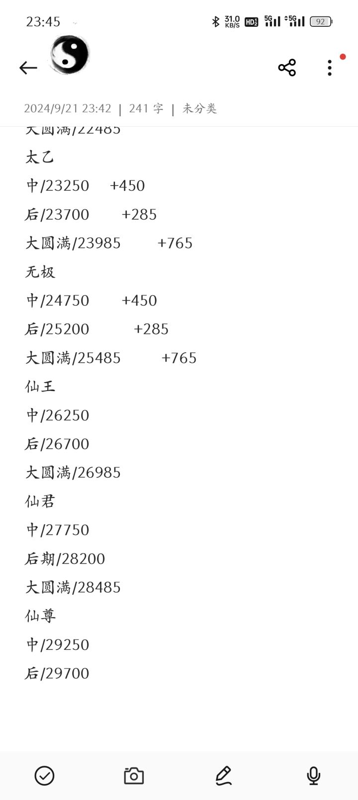 每个大境界中有三个小境界:初期→中期,中期→后期,后期→大圆满。每逢小境界都需要五倍灵气用于冲破桎梏。在修为达到化神后,还需要天道圣果来辅助突破。具体数量参上。“/”后面为天道圣果需要数量。大境界(散仙以下):练气(1级)—聚灵(30级)—筑基(60级)—结金(80级)—元婴(110级)—化神(200级)—返虚(300级)—合道(500级)—大乘(650级)—渡劫(800级