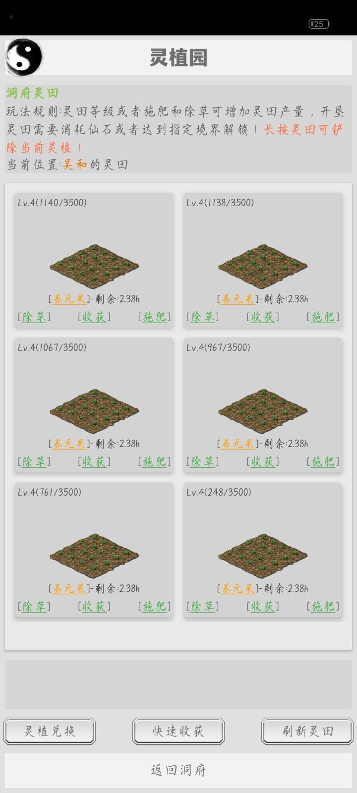 种植需要在灵植园内操作。进入方式:主页洞府—右下灵植园。种子在灵植园右下—灵植兑换。流程就是灵植兑换买种子—种植—除草(一键)—施肥—一键收获,如此反复。灵田等级:灵田初始为一级,种植经验满后自动升级。普通材料(一小时)每次收获经验加三中等材料(二小时)每次收获经验加五高级材料(四小时)每次收获经验加十稀有材料(六小时)每次收获经验加二十产量:普通材料(一小时)基础产量为8,