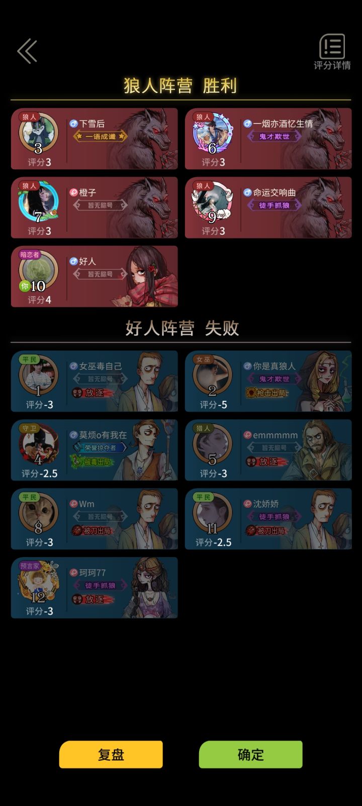 (ps最后一把狼人爆杀真的很爽。倒数第二吧预言家打那么久纯粹是因为猎魔人不扎,扎了能少打十分钟,本来简单模式硬是给我玩成了地狱模式)
