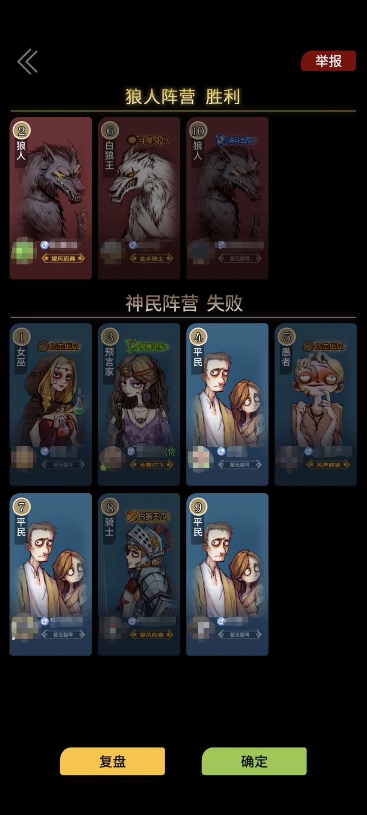 第一晚5号被刀,1号女巫没救人,5号出局时报了自己的身份是愚者,4号跳狼人,我报预言家发了4金水,2号啥也没说直接过了,1号直接破口大骂(省略脏话)说我报什么神职身份,说4号已经报神职了那狼人找到剩下的神职就没了,还说自己就不救我了,后继10号对跳预言家发7金水,6最后拖时间让骑士8刀了10号狼然后女巫直接把我毒了,6就自曝刀了骑士,就这样没了赛后1号还搁着骂然后把我踢了,不知道举报有没有效我