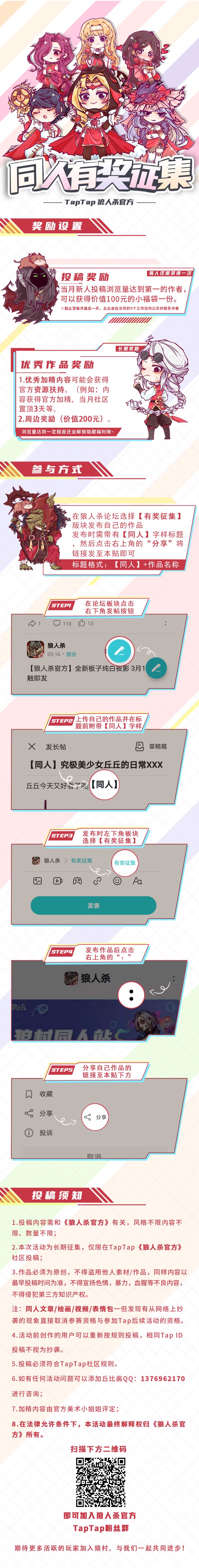大家好呀~丘丘又为大家带来福利了哦!近日丘丘发现社区和玩家群中发现了许多玩家自发创作了优秀的同人文,同人画以及用bug图制作出各种搞怪视频以及表情包。 再次感谢大家对我们的喜爱,为了不辜负大家的努力和期待!丘丘现在宣布:同人作品征集活动❀ 正式开始啦!!!本活动将作为常驻活动哦。详情如下图↓↓↓欢迎更多活跃的小可爱加入我们狼村的大家庭~丘丘会时不时在群内放出福利哦!狼人杀官方tap群:1