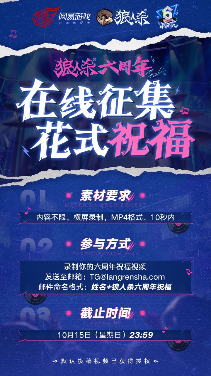 丘丘来在线征集各位狼队友的周年花式祝福啦~一起行过六载时光,大家都有什么话想对狼人杀说呢?这次话筒交给你!录制下你的狼人杀六周年祝福视频,发送至图中所示邮箱,即有可能出现在狼人杀六周年庆祝福视频合辑中哦~征集截止时间为10月15日23:59哦,快来发送你的祝福吧,丘丘已经等不及要听到大家的声音啦!