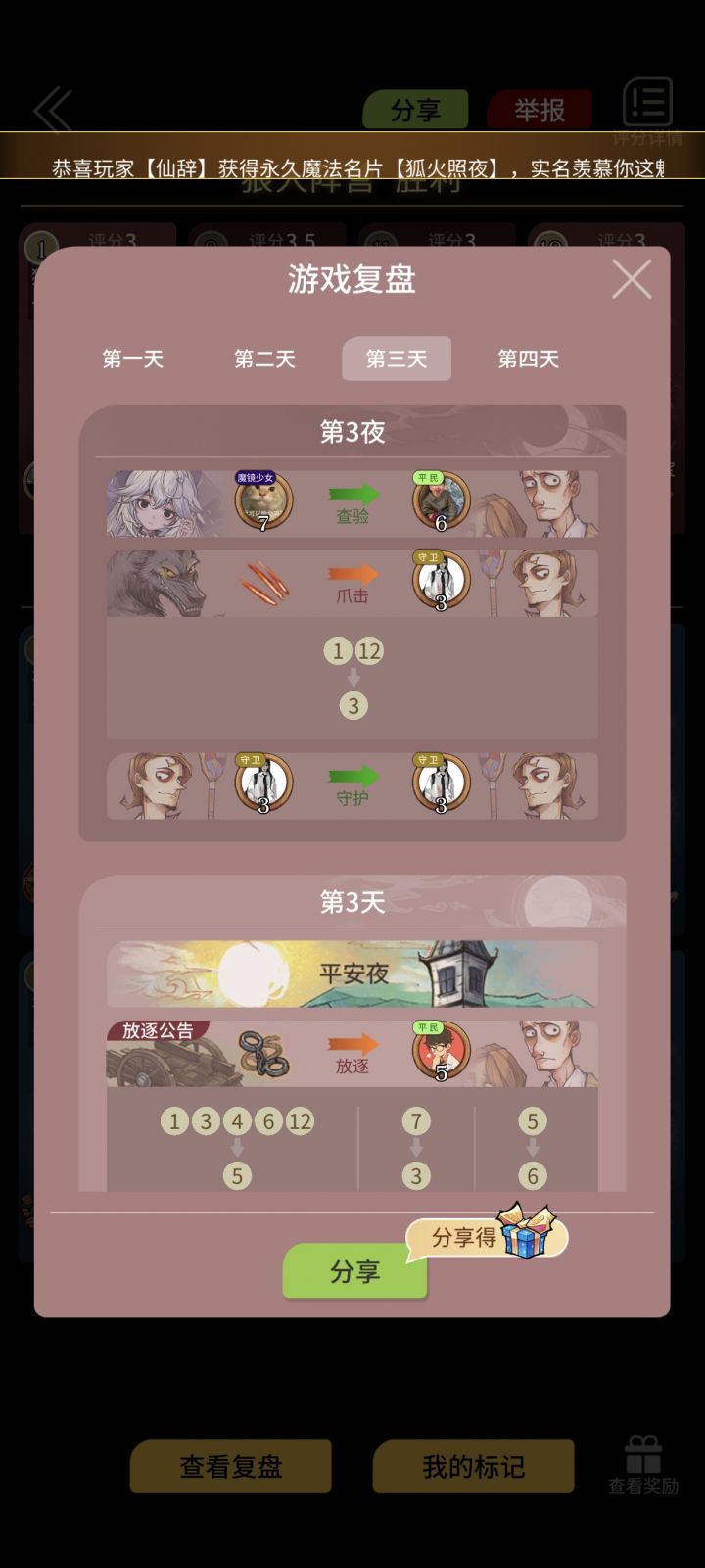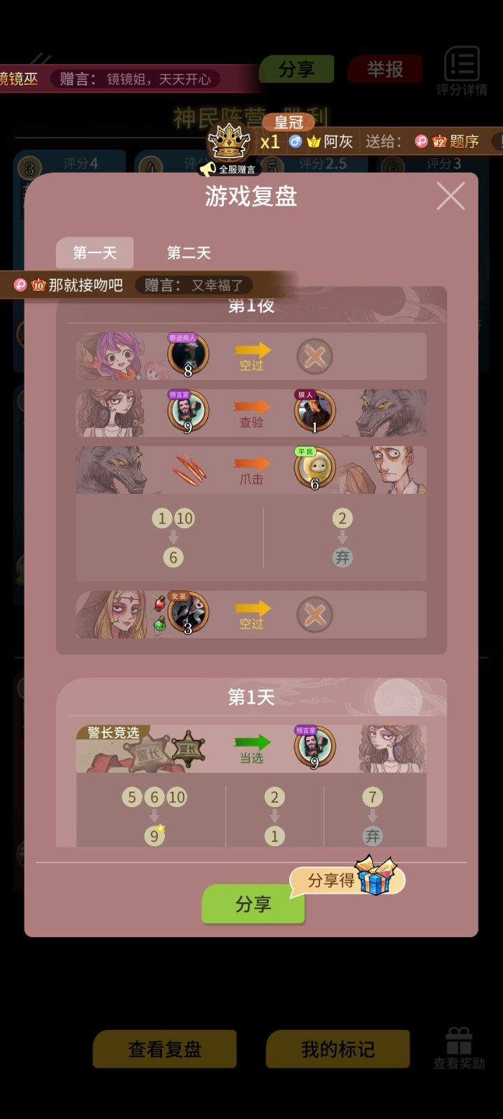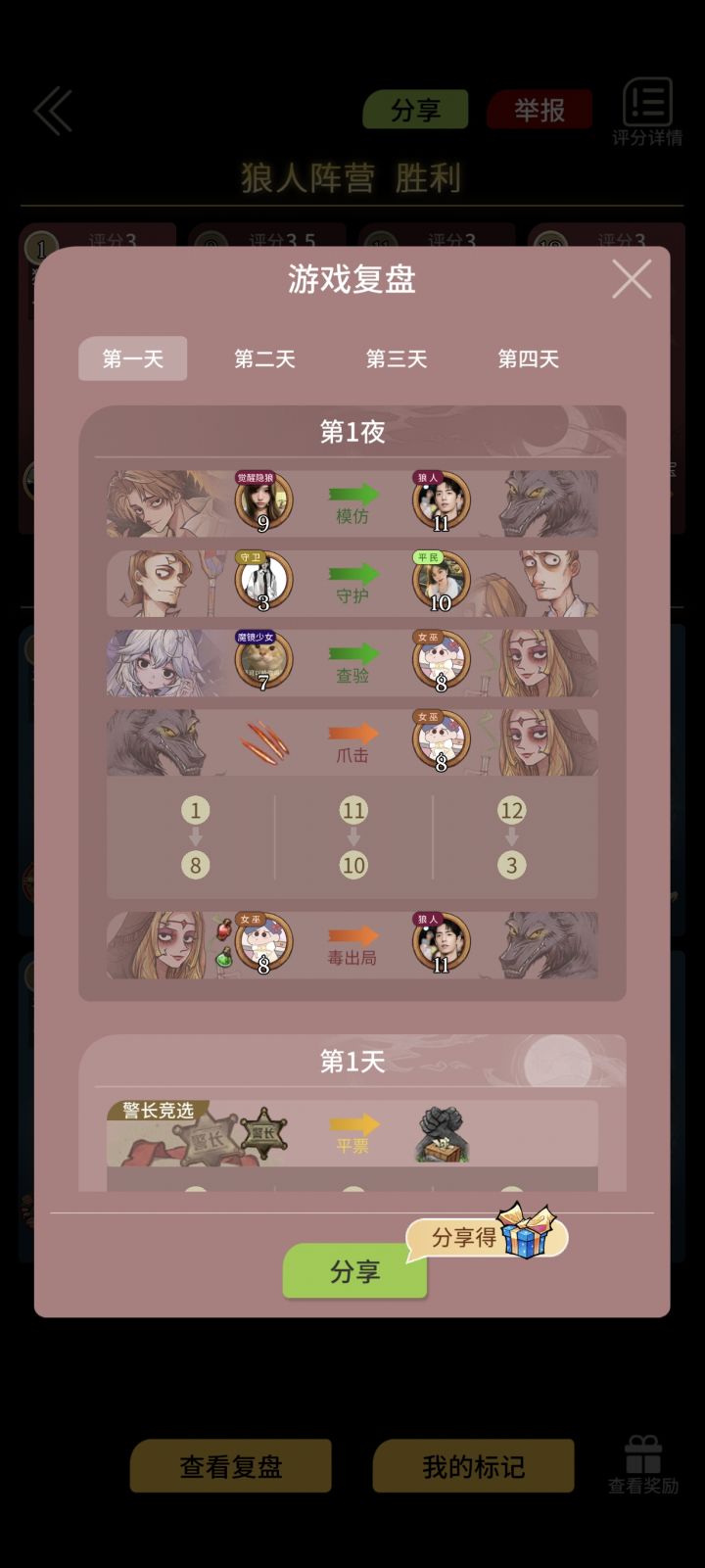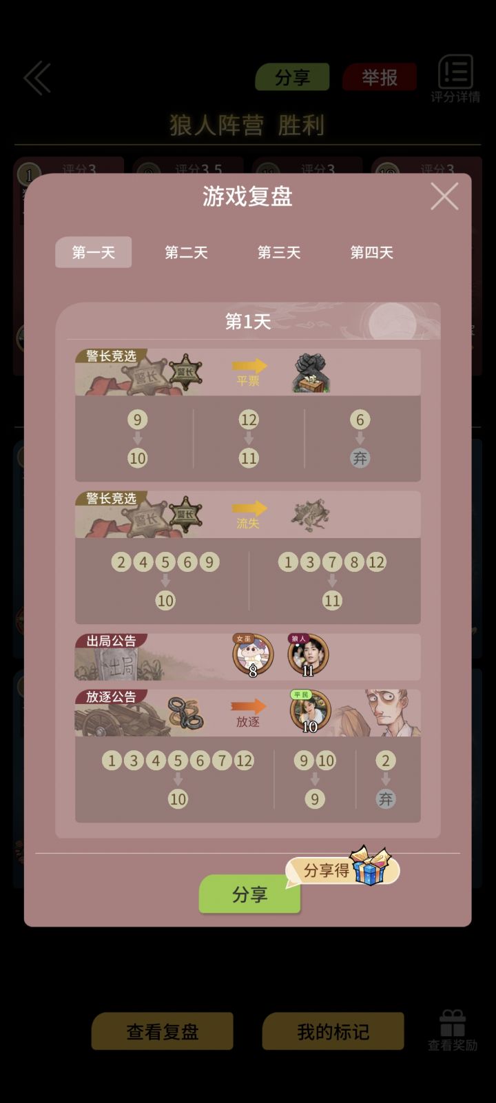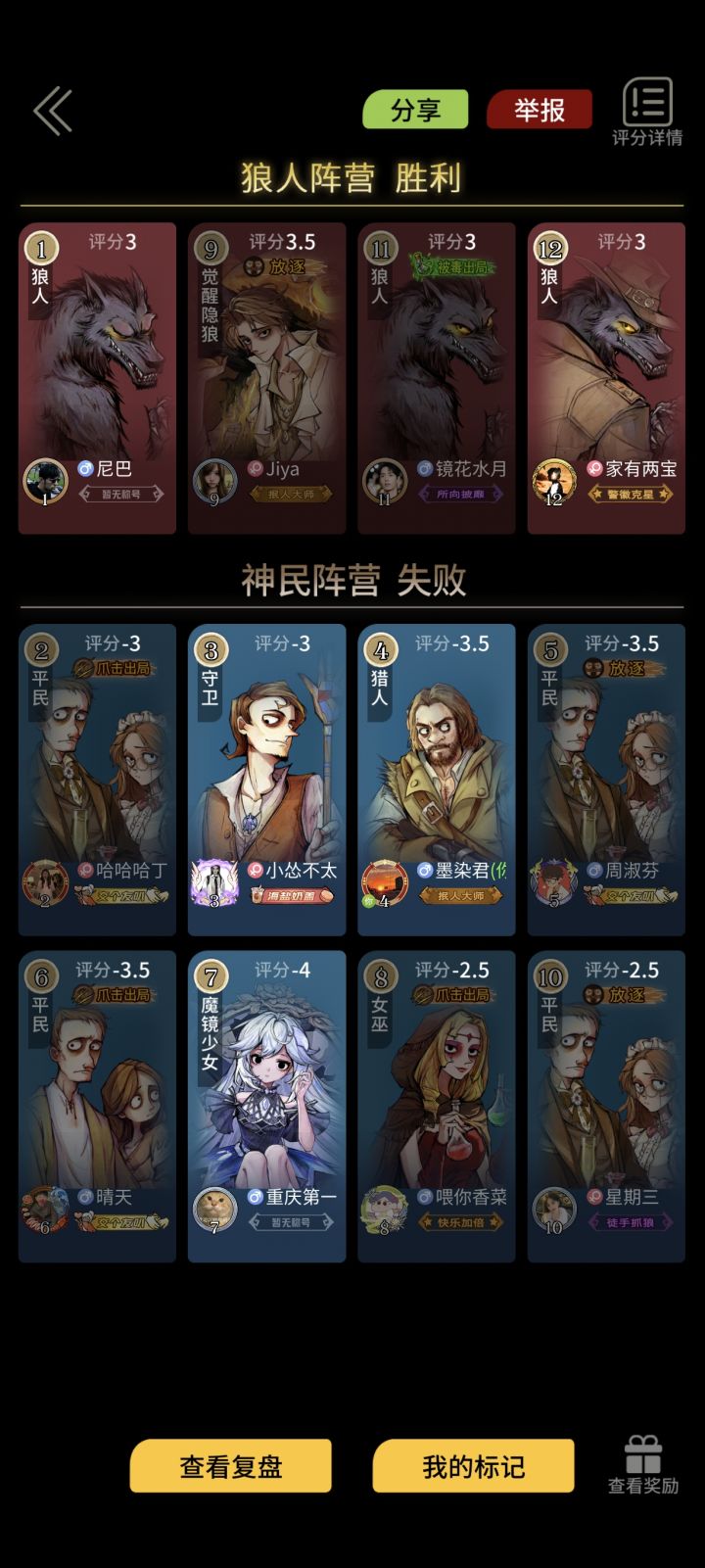 我是9号机械狼学了5号通灵师,我第一个起跳通灵师给5发查杀,小狼6号第二个跳通灵师给3号小狼队友发守卫,5号真通灵师最后跳出来给8发村民,8号反水不认真通灵师,唯一一个在警下的11号猎人给6号投票,我真服了,小狼跳这么差还能拿警徽的