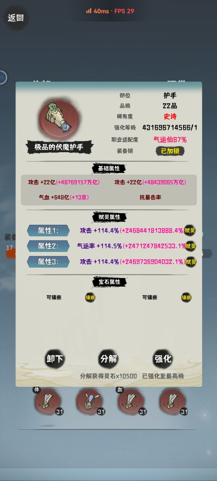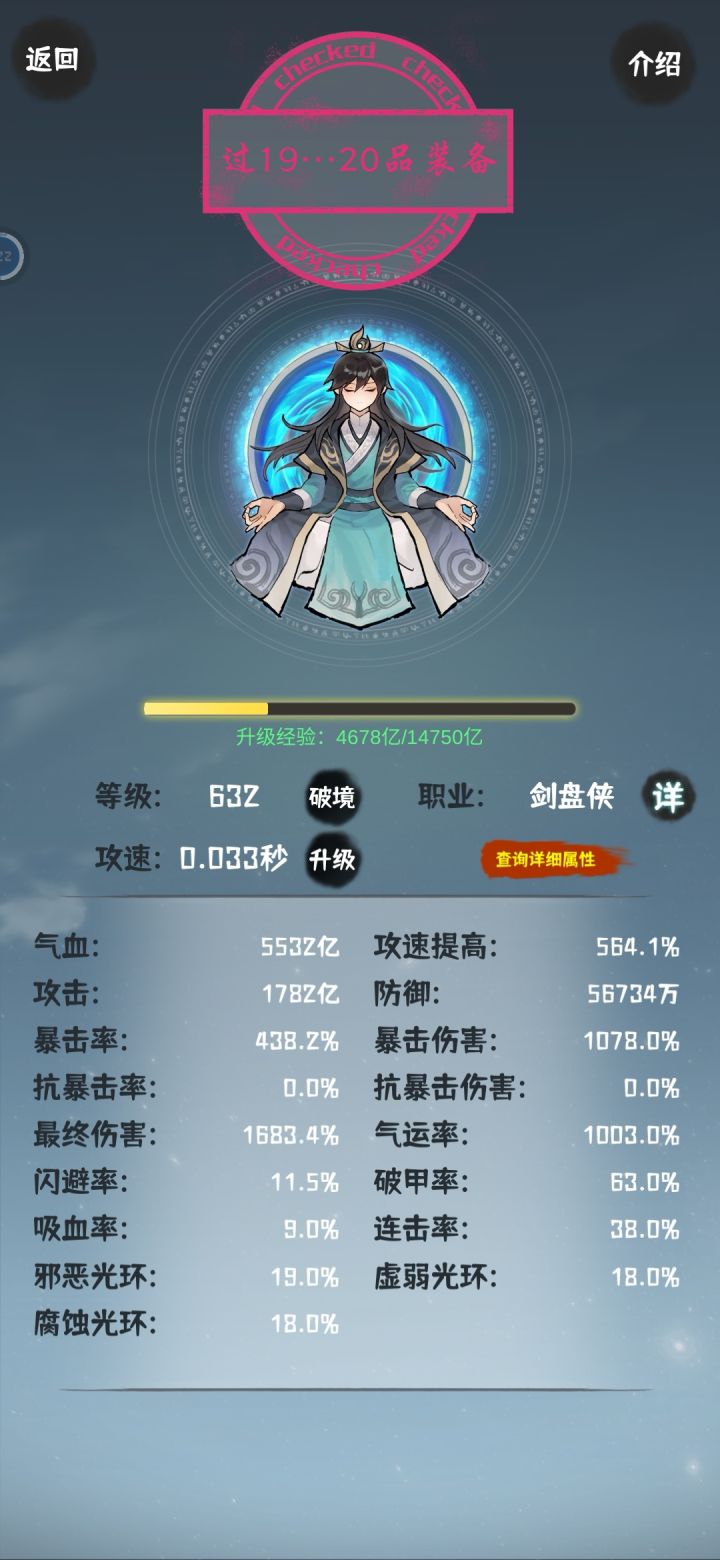 来和大家说一下这个游戏20品以后的正确打开方式每天晚上9点半上传一次存档,然后第二天早上起床进游戏收菜,只看有没有合适的装备,如果没有,就退出重进然后下载存档覆盖就可以重置一晚上的新装备。哇咔咔,可以一直重置到满足,或者次数用完。那么装备的收益就能比以前多很多倍。但是不要贪,遇到一件能替换的就很不错了,千万别刷过了。每天早上收菜都很满足。虽然掉率和好装备概率确实很低,但很舒服。然后每次弄好了装备,记得及时上传一下。