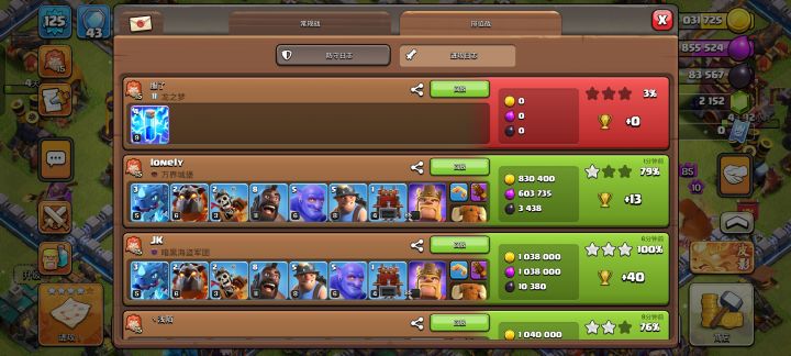刚放完法术,正准备攻击放军队的,结果一看网不好,重连之后摧毁率为零,直接给我退出来了