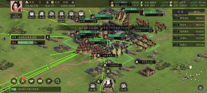 进去啥也别干过完新手就直接招募骑兵八百一队先去搜寻一个武将然后去打服他抢回来然后过历练任务掠夺小城一到十级那种在第一阶段霸业或者县城开始之前就是掠夺捞钱屯兵一般县城五万投石各种兵带一个当炮灰第一阶段攻城所有兵防御一直等平局回家第二阶段继续全部防御不动等对面过来杀光第三阶段攻城随便带几万都行攻城两次或者三次成功占领要捞武将之前要把县城名额或者土地全部打满然后一直攻城直到抓住为止然后郡城有两种打法但是