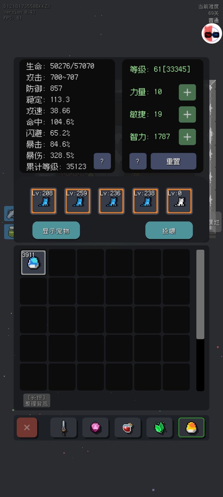 鸢克斯2023年6月11日 14:28-0.43新增npc,提供分解,物品重铸新增被动技能新增关卡至149关新增装备至90级强化数值系数进行了调整强化等级上限调整至100宠物伤害更改为真实伤害宠物伤害计算方式进行了调整宠物技能cd进行了削弱宠物技能部分伤害跟人物智力挂钩调整了人物属性加成装备强度有所调整,旧版装备不受影响掉落装备属性调整为30%上下浮动装备外观更改为掉