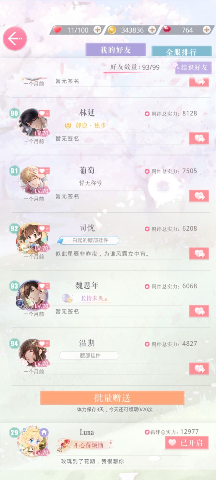 就是由系就是游戏里的这个好友功能,能不能按照登录时间去排序?有一些人啊,这个游戏玩了个一年多的时间退游了,然后他就在我的这个好友列表里卡在一个不上不下的位置,她就算一个多月不登这个游戏我都找不到她,所以我每一次清好友的时候,我得一个一个的往下翻,仔仔细细的去看我有好多好友就卡在中间的那个位置,十天半个月、一个多月不登游戏,我也不知道干啥去了