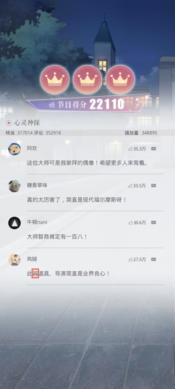 原文:此“篇”道具、导演简直是业界良心!校正:此“片”道具、导演简直是业界良心!位置:精英关卡-第9章·长梦初醒-9-2心灵神探(通关后网络评论)