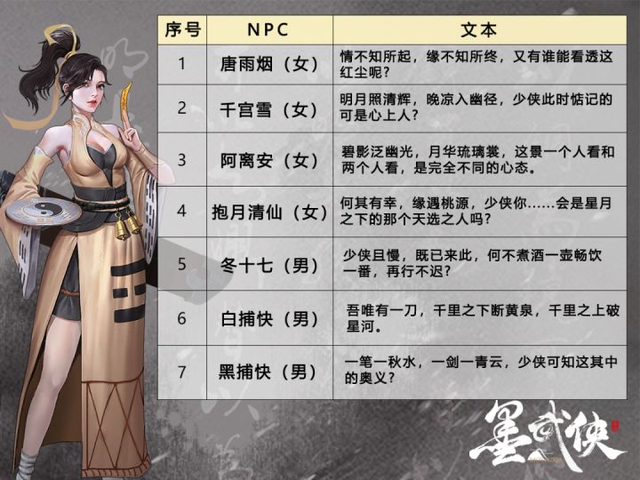 自第一期“听见你的江湖”配音活动结束后,师姐和小师妹收到了各位少侠的消息:我们真的会在游戏内听到自己的声音么?什么时候开展第二期配音活动啊?能在丰富一些不同类型的角色嘛?.......对于少侠们的各种问题,师姐话不多说,今天就带着第二期活动闪亮回归!本次的文案依旧是来自游戏内的7个NPC的对话文本,每句话都是摘取自游戏内展示的真实文本哦~各位少侠可以在下面的表格内自行选择喜欢的句子,录制成音