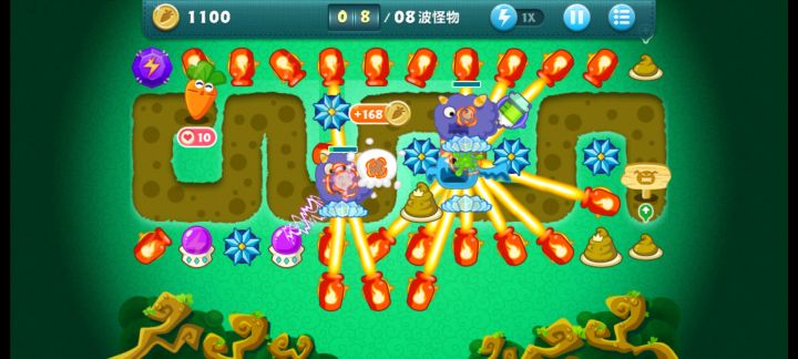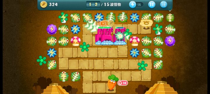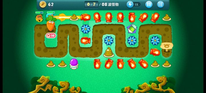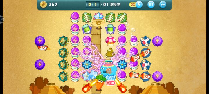 金萝卜+道具全清1.把第三排的蘑菇种出来 在种第四排的粑粑。然后再将上面的毒刺卖掉 换成冰冻星星,再将左边的一个风车卖掉 换成冰冻星星,到这里基本你就可以已经稳了(蘑菇粑粑 冰冻星星优先 全升3级)。2.把左上角第二个大箱子给打掉,打掉之后再把右边的给打掉。这样你就有钱去升级两边的紫色宝石,紫色宝石优先升级上面的那两颗。到最后就是暂停一下,把风车还有绿色能量瓶换成紫色水晶球。至此 你就可以趁着