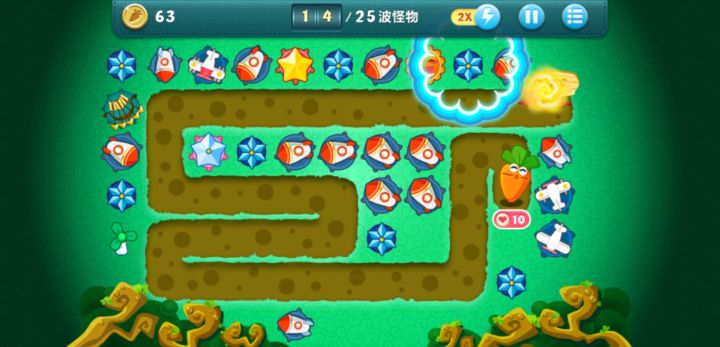 注:彩石都是火瓶先放一个火瓶,清下面的彩石,升两三个火瓶到二级后放一个蘑菇,挑一个火瓶升满,蘑菇升满刷钱,左边凹陷处放一个蘑菇,接着最右边清空放扇轮2个左右,可以先升满(扇叶可以清怪的同时清左边道具),然后慢慢清道具就行,基本上扇叶和火瓶就够了,最后的boss的时候把火瓶尽量升满吧