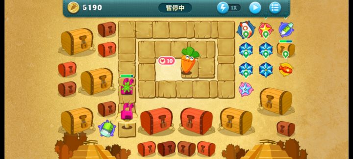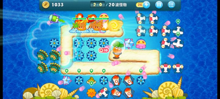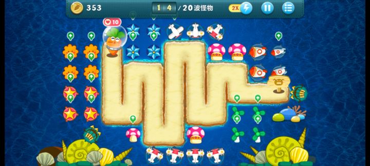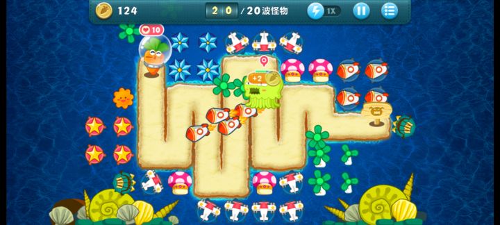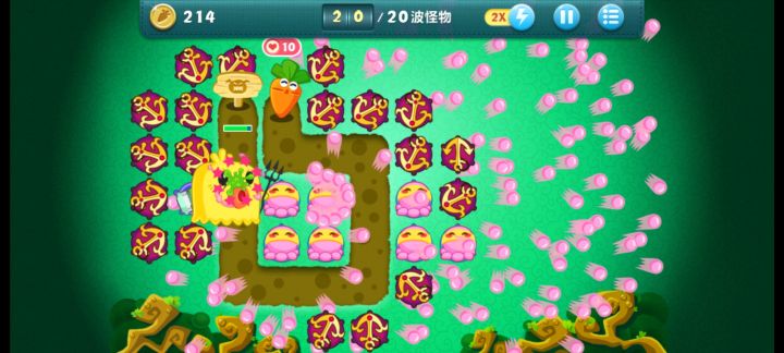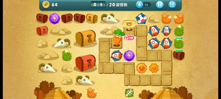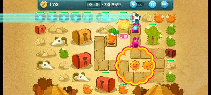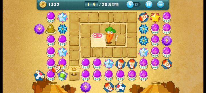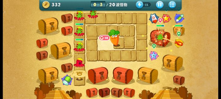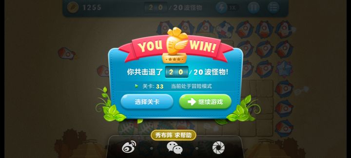 终极挑战33关,无伤全过,道具全清。开局飞机,升二级,清出两个太阳,一个太阳升二级,靠他们俩清怪,飞机清道具升顶级。清出位置种火箭,中间宝石必出升顶级。右边冰星是必出的,升顶级全靠它减速了,后面的鱼刺也要升满级,整个路线就靠冰星和鱼刺。前面火箭种好了把后面的毒箭补上。