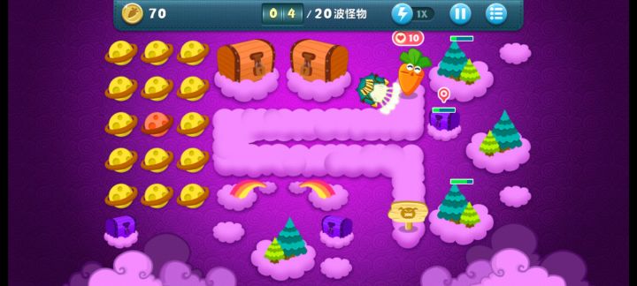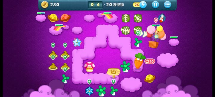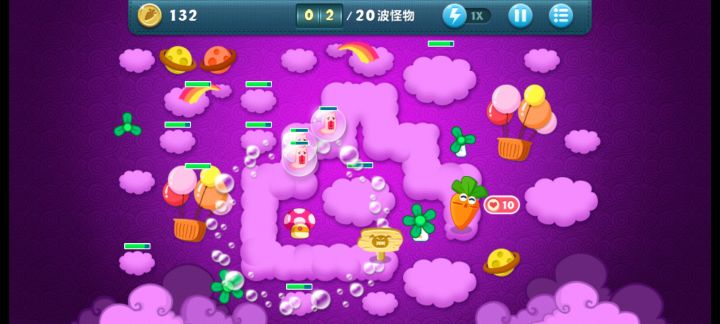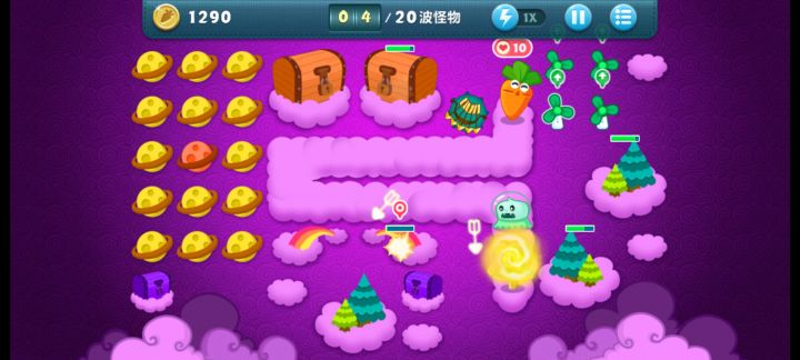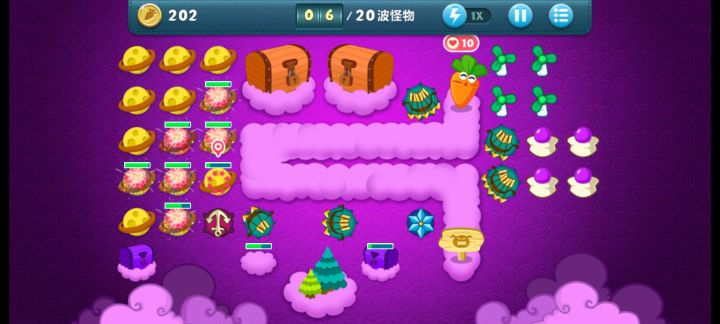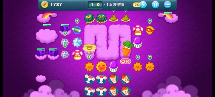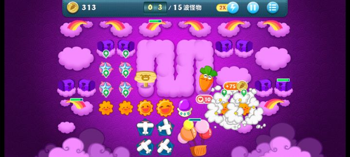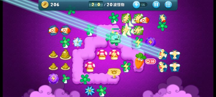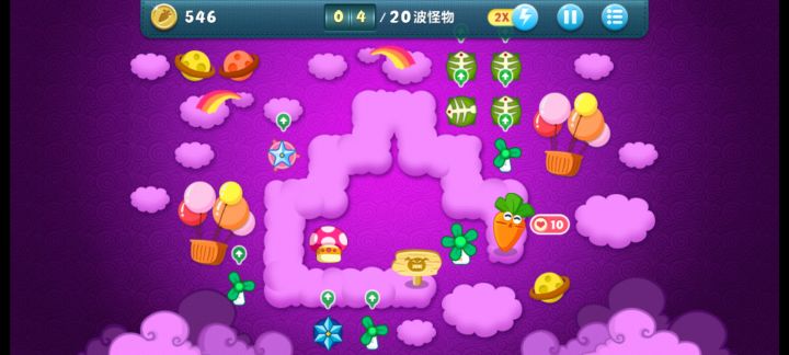 终极挑战36关,道具全清,无伤全过。这关挺简单的,一次就过了。先满级风车打下面中间的云,能顺便清怪,后面再补一个风车补漏的怪。把前面冰霜打出来。下面大云有四个蘑菇我不知道,所以我自己先种了三个,感觉这四个也没什么用,范围太小了可以卖掉。主升火箭,鱼刺,冰星,角落补风车,飞机可以后面再升两个顶级的。记得补顶级宝石。