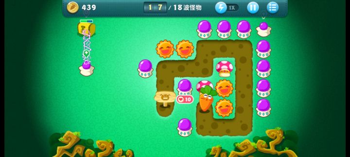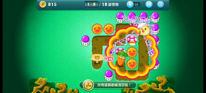 终极挑战39关,无伤全过,道具全清。先种电菇,升级,打中间道具,边清怪。然后种出太阳打范围伤害,再种红蘑菇减速赚钱。把宝箱清了,先种顶级太阳,打范围伤害,电菇去打道具,赚了钱再种顶级电菇。