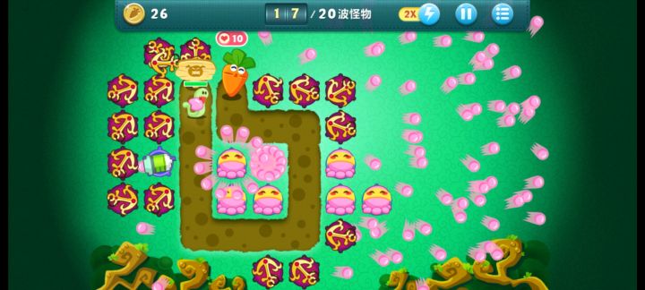 终极挑战26,无伤全过,道具全清。先种后面的箭,把五角星宝箱打出来,再种前面的箭,把火箭打出来,之后就清道具和宝箱,把边边角的蘑菇种出来升顶级刷钱,还能减速。先升级火箭,有钱了把所有地方种飞机,全部升顶级,冰霜也可以升两个顶级。最后面20关的大boss血很厚,把五角星删了种飞机,把前面的火箭删了全升级后面的飞机,把大boss拿下