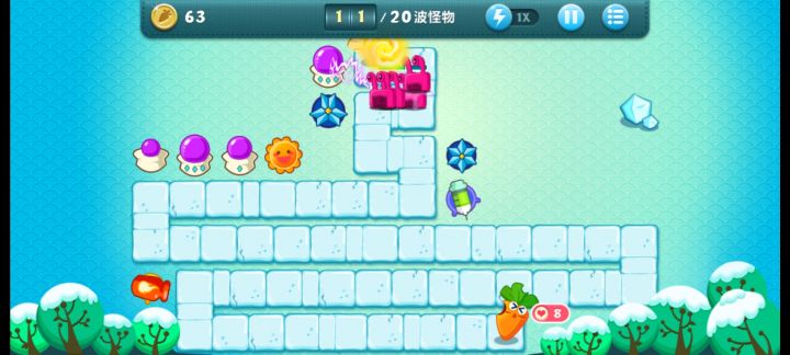 前期先侧重后面,因为前面的道具需要时间清理。 需要先把后面的塔升顶级,让伤害高起来,控制冰冻也需要到位。 前面道具清理完就可以往前延伸种鱼刺和冰雪