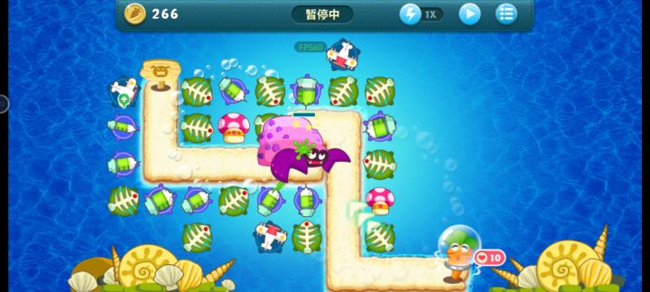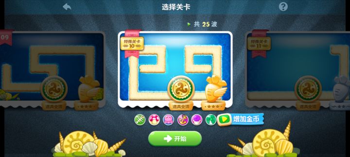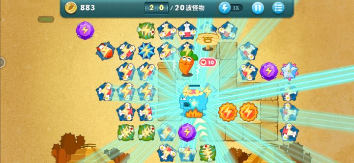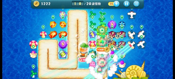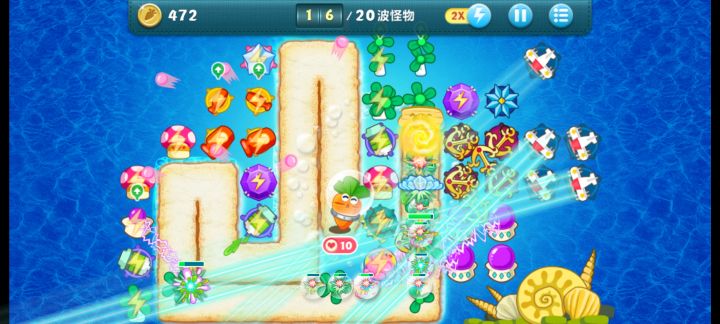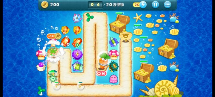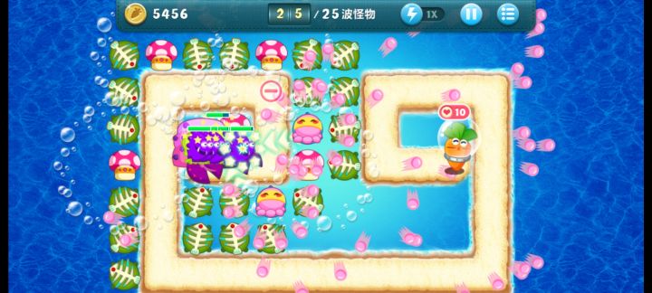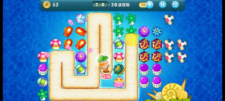 开局下图位置放个绿瓶子快速打掉海星。海星开出一个鱼刺后攻击上面的宝箱,在第3波的时候将大宝箱打开,果断买到1个放上深海蘑菇,其他的3个升到满级。继续清理道具,优先把左边的冰冻星星升到满级之后在升级火箭。第12波阵型,道具清理的差不多了。左边可以在放两个深海蘑菇来刷刷钱。把左边的第一个绿瓶子给卖掉换上雪花,剩下的有钱了就放绿瓶子吧。最后一波boss出来啦。保卫萝卜深海13金萝卜到手。原