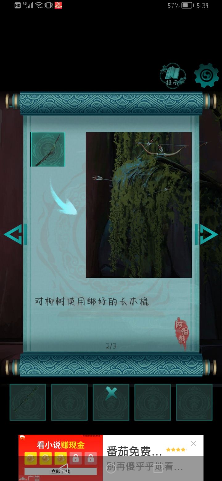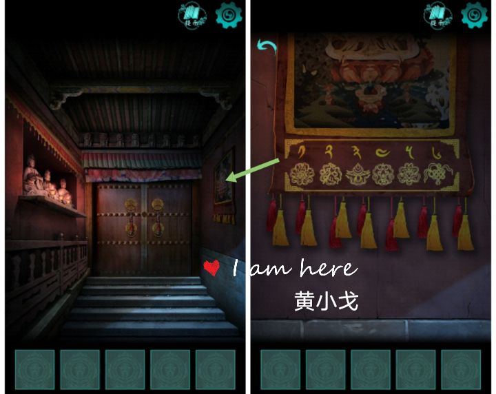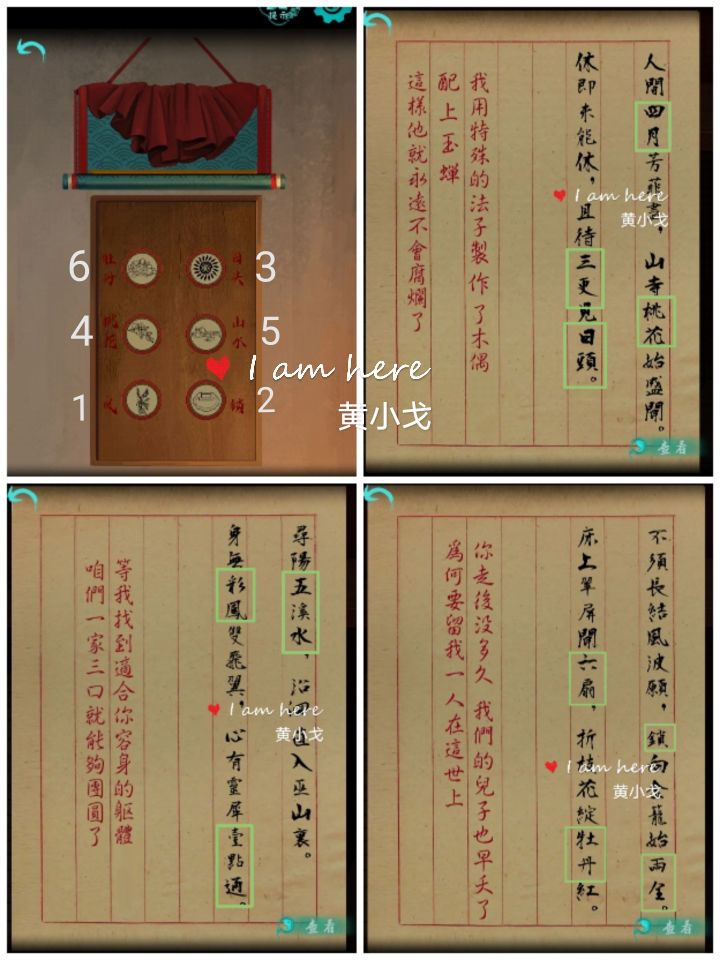 第六章:风雨停1.根据信件开头的诗句中的数字和内容,按照凤、锁、日头、桃花、山水、牡丹的顺序点击花纹鼓2.暗格打开,查看里面的画卷(天地之大浮云明月列左右,南北之中山远水近犹可得)3.(暗门)点击查看右边门上的画卷(天大地大日升星坠不可触,东西之间一人一偶千年行)4.点击门上的机关锁,根据两个画卷中的诗句,把图案铁块移到正确的位置5.(财宝室)点击架子上的人偶头,查看她们的发型(右、中、