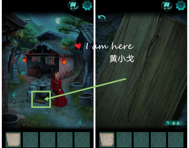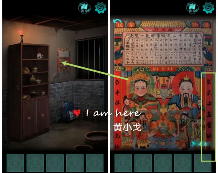 第一章:红颜远1.(完成剧情引导后)(杂物间)点击灶王爷画像,获得线索:柴米油盐酱醋茶2.点击柜子第二行的罐子,罐子掉到地上3.点击掉在地上的罐子,发现是醋4.根据柜子后面的符号(左右),按柴米油盐酱醋茶对应的方向(右右左左左右右)的顺序点击下方柜子上的按钮5.打开柜子,获得【锤子】和【擀面杖】6.点击铁链,用【锤子】砸开墙7.点击墙角的书包,拉开拉链8.获得【衣服】9.点击地上