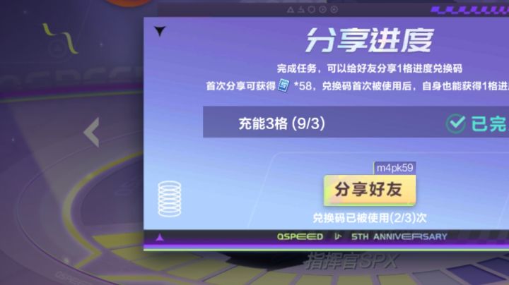 【QQ飞车手游五周年】永久A车大回馈,充能15格必得指挥官spx等随机永久A车!送你1格进度,助你获取永久A车!12月31日,登录领大喷变色A车闪耀之星,还有588钻石免费拿!一起祝QQ飞车手游五周年快乐!我的兑换码为:m4pk59,复制本段话前往游戏内【活动】界面获取~