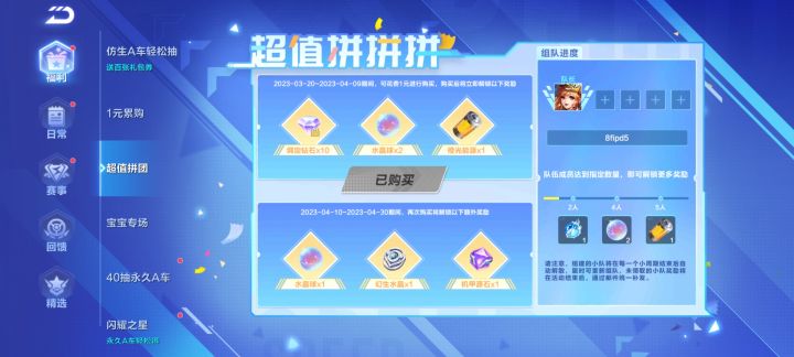 组队拼拼乐,有你更超值!复制代码:9617pd,即可加入我的QQ飞车手游拼团小队,一起解锁超值奖励!