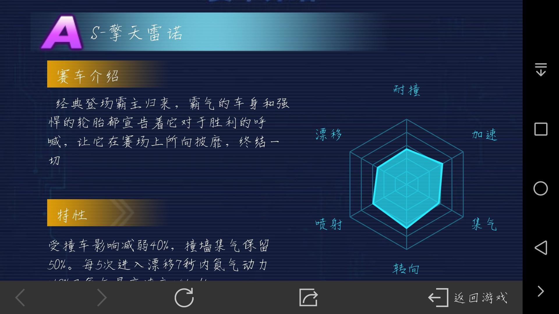 版本六维图bug,肯定影响了赛车。现在就问在座的雷诺党是不是被其他车撞飞过。车库里赛车信息旁边的攻略里的。话说官方为什么不直接把六维图提高成七维图八维图?你搞个可换角度看的六维也行啊。还有,原来的雷诺强度74,按照特性来算没有180是撞不动的,但如果是图片里的耐撞强度呢?很明显轻轻松松的被撞。