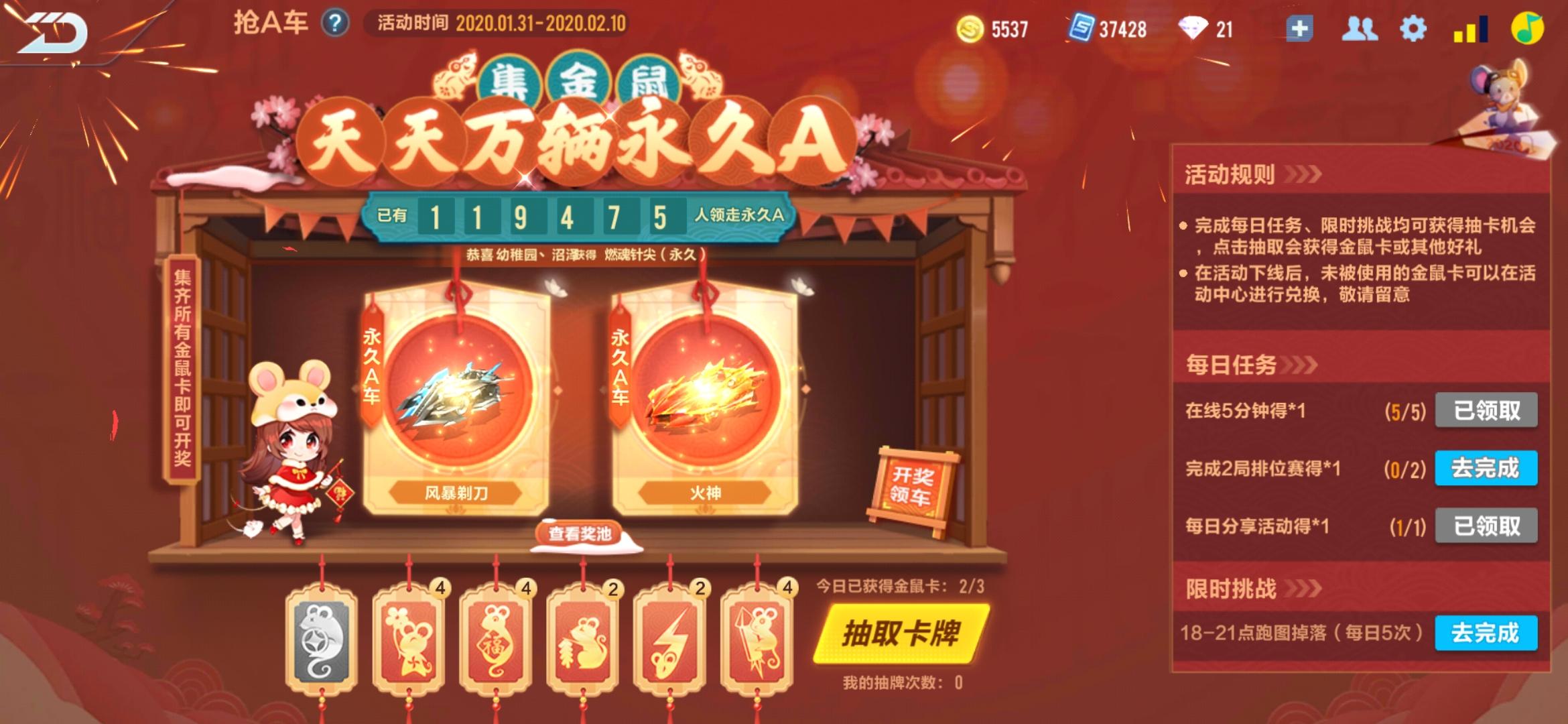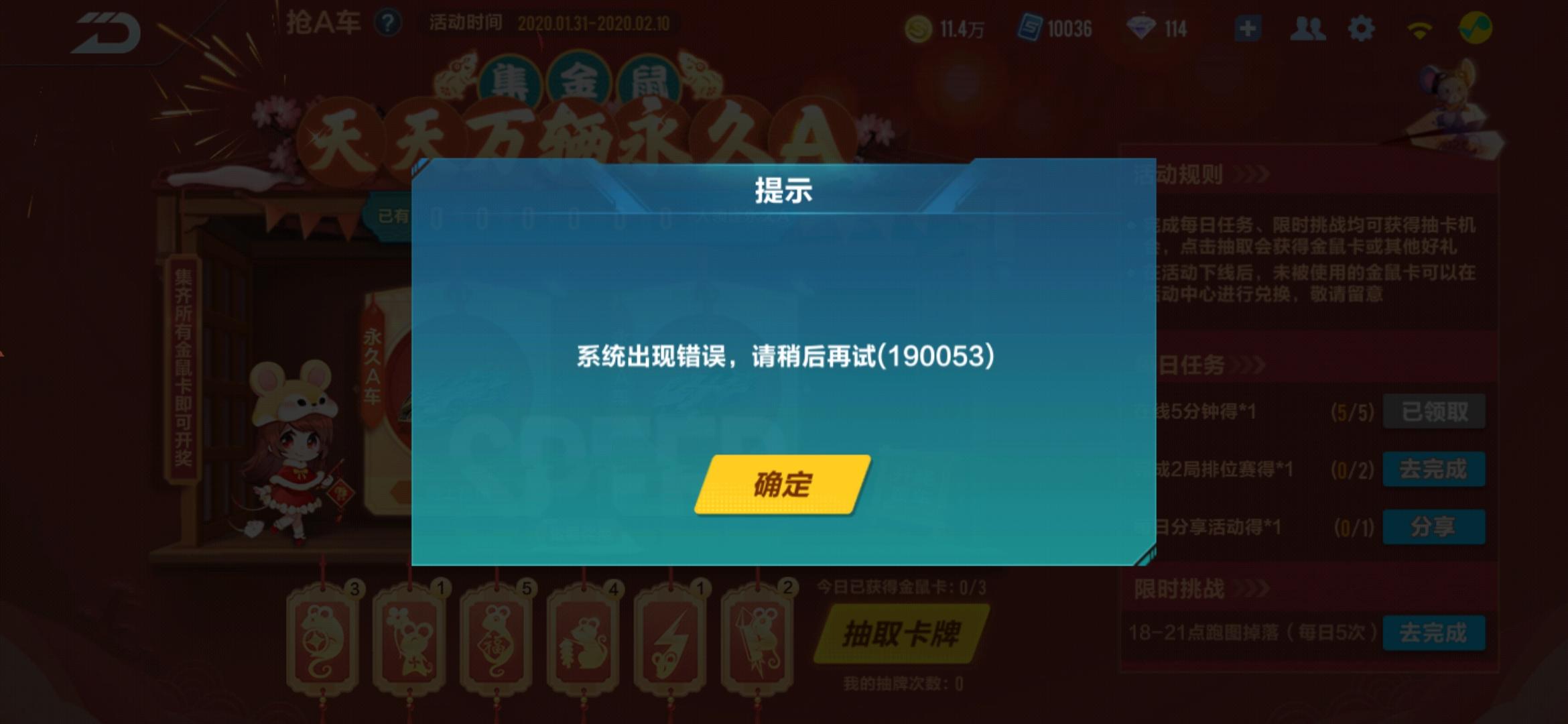 天美你她妈几个意思?我说金鼠卡怎么没人得A车,你丫就这么整玩家啊,我她妈集齐了卡,点抽奖,你告诉我系统错误,让我稍后再试,我她妈退出去再回来怎么给我三张卡删了???你们家一个A车的代码这么值钱吗,你TM给个限时的也行啊,我有双生我也不计较,你踏马什么都不给直接删我三张卡什么意思???