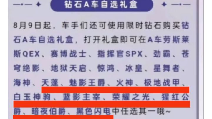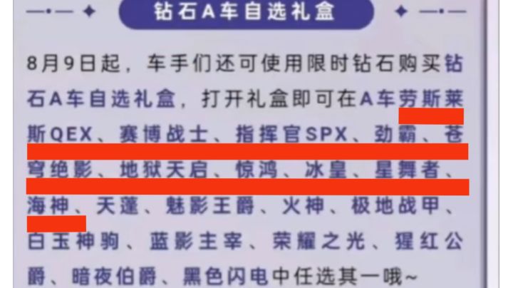A车劳斯莱斯QEX、赛博战士、指挥官SPX、劲霸、苍穹绝影、地狱天启、惊鸿、冰皇、星舞者、海神↓↓↓8月9日上架限时钻石购买钻石A车自选礼盒(上)https://www.taptap.cn/moment/688254731138632444?share_id=b8b88662d848&utm_medium=share&utm_source=copylink↓↓↓↓↓↓↓↓↓↓↓↓↓↓↓8月9