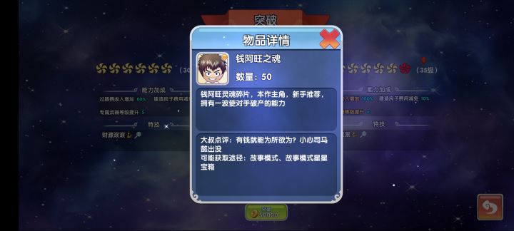 1、魂石兑换,自动分解所有“多余”碎片,但是最新的突破功能还必须要用角色碎片,所以现在都不敢自动分解了。能否把这个冲突矛盾解决一下?要么自动分解时留下足够突破数量的碎片,要么可以用万能碎片突破。2、钱阿旺的碎片根本没有其他获取渠道,故事模式全得到手的钱阿旺碎片只够升满级的,没有多余的碎片,所以钱阿旺目前根本没法突破。