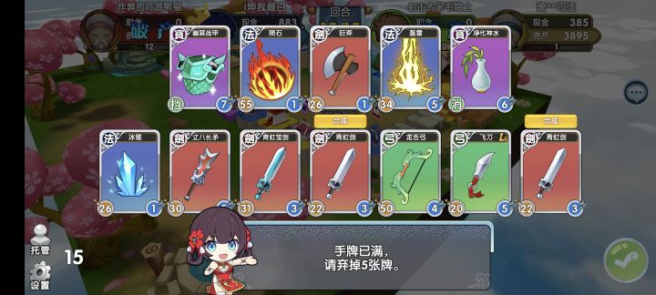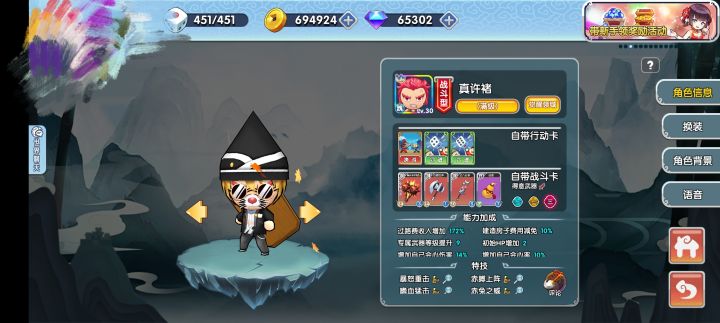 最近看到大家在弄新角色的设计,我虽然没有什么新角色的想法,但是想到了不少新技能,仅供参考祸水东引 触发概率30-50%场上有人使用锦囊牌(决斗,五谷丰登,洪水,草船借箭除外)触发,自己可选择改变被使用的角色或者让这张牌无效化(期间自己不知道原本被使用的角色是谁)以退为进 触发概率100%决斗开始前夺取对手(2-6)点攻击步步高升 触发概率70-100%行走步数≤4时获得1张随机卡片(因