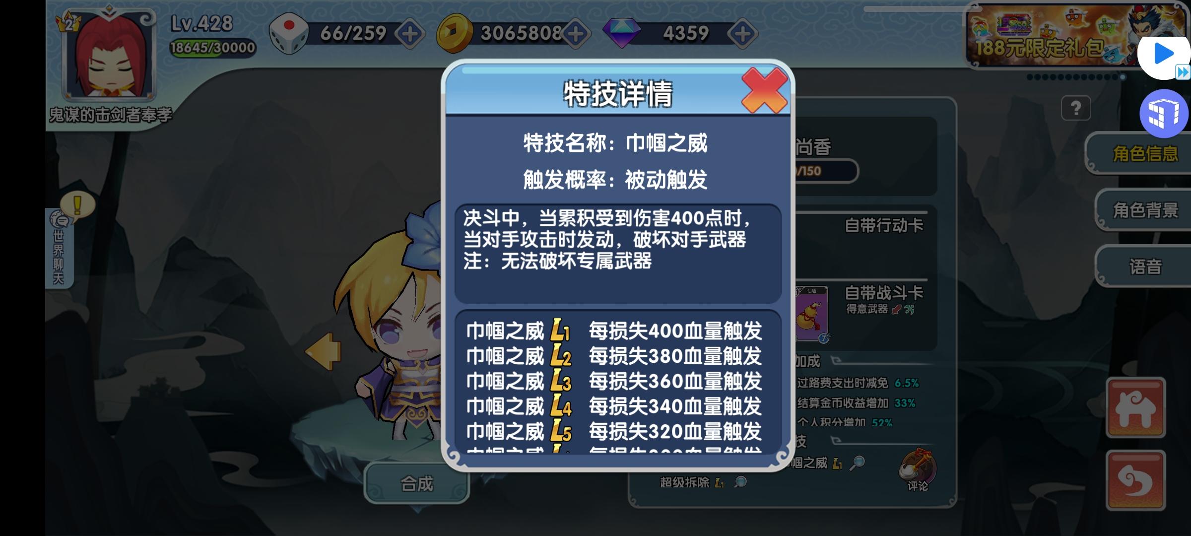换卡技能max为38%,属于正常水平吧,助益补治技能触发概率实测了十几局,目前国太无论1带2,还是1带3,该技能概率基本很低很低,太难触发了。尤其是组队模式,均没有地。这边期望能否和其他策略型SSR一样把助益补治技能调到60%,或给配个加5%概率的800五彩石专武更佳