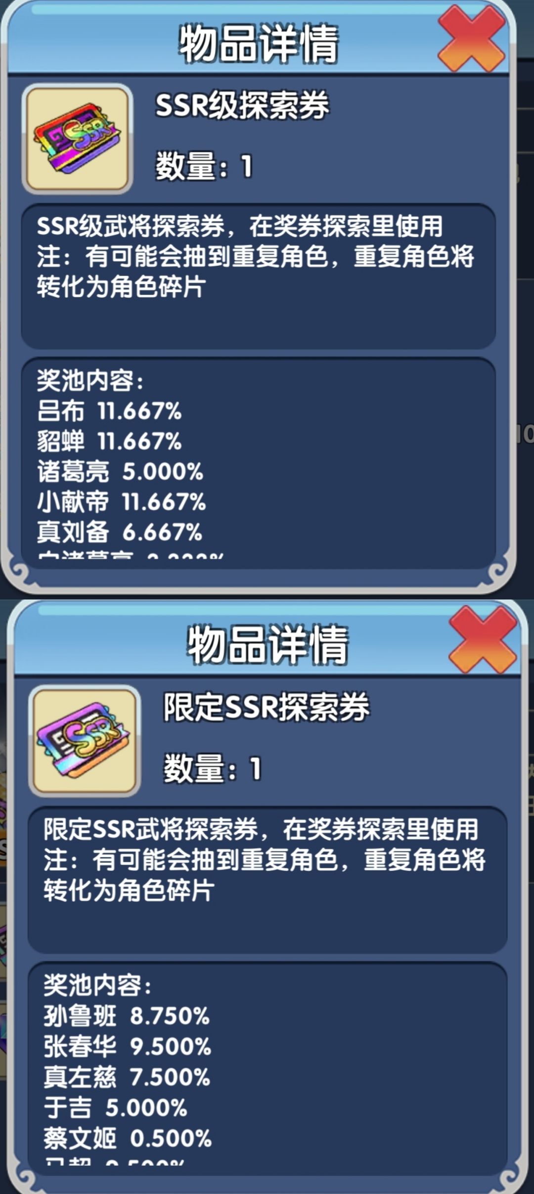 SSR探索卷:吕布、貂蝉、小献帝:11.667%;真孙权、真周瑜:8.333%;真郭嘉、张宝、真刘备:6.667%;诸葛亮、孙策、袁绍、廖化、张昭:5%;白诸葛亮:3.33% 限定SSR探索卷:马超、关银屏:9.25%;鲁肃、孙鲁班、黄盖:8.75%;张春华:9.5%;真左慈:7.5%,于吉、司马徽:5%,孙坚、潘凤:3.75%吕玲绮、伏皇后、祝融、曹冲、王异、南华仙子、王元姬:2.5%;张角、曹