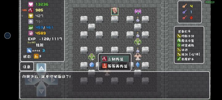 1.最重要的断线重连。没有断线重连,有几次接个电话游戏就掉线了,然后重新登录就只能新开游戏。明明有个自动存档读取,为什么不能断线后可以选择继续游戏?2.穿墙和斜传直接传送到道具上是拿不到的。必须要从道具上离开再回到道具上才能拿到。导致有些四面被围住的道具根本无法用这2个技能拿到。3.第5关随机刷出来的怪有的时候会把出入口直接堵死。导致无法返回上一个地图4.几个改变地形的技能消耗的法力过于高了