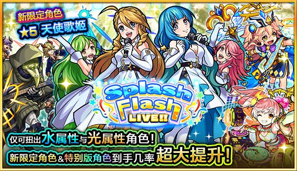 ·扭蛋活动「Splash Flash LIVE!!」将于7月13日(周六)开始!新限定角色「天使歌姬」将初次登场!期间限定特别版「恶魔・朋克・炼狱」也将登场!本次扭蛋活动中,只会扭出包括「雷米尔」「圣德芬」在内的「水属性」与「光属性」角色!新的水属性限定角色「天使歌姬」及特别版期间限定角色「魔狱的恶魔・朋克・炼狱」、「骚乱的恶魔・朋克・炼狱」也将一同登场!详情请点击·【怪物弹珠国服2周年预
