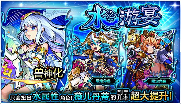 扭蛋活动【水之游宴】即将在2019年1月9日(周三)开始!本次扭蛋活动中,只会扭出「水属性」角色!千万别错过这个获得「水属性」角色的机会哦!兽神化解禁「薇儿丹蒂」的到手几率超大提升!※抽取「10连幸运扭蛋」另外加送「魔法石」(每次5个)。(「幸运扭蛋」不含加送赠品,敬请谅解。)※每获得1位★4角色,可同时增加1个「」。▼活动期间2019年1月9日(周三)12:00 ~ 2019年1月1