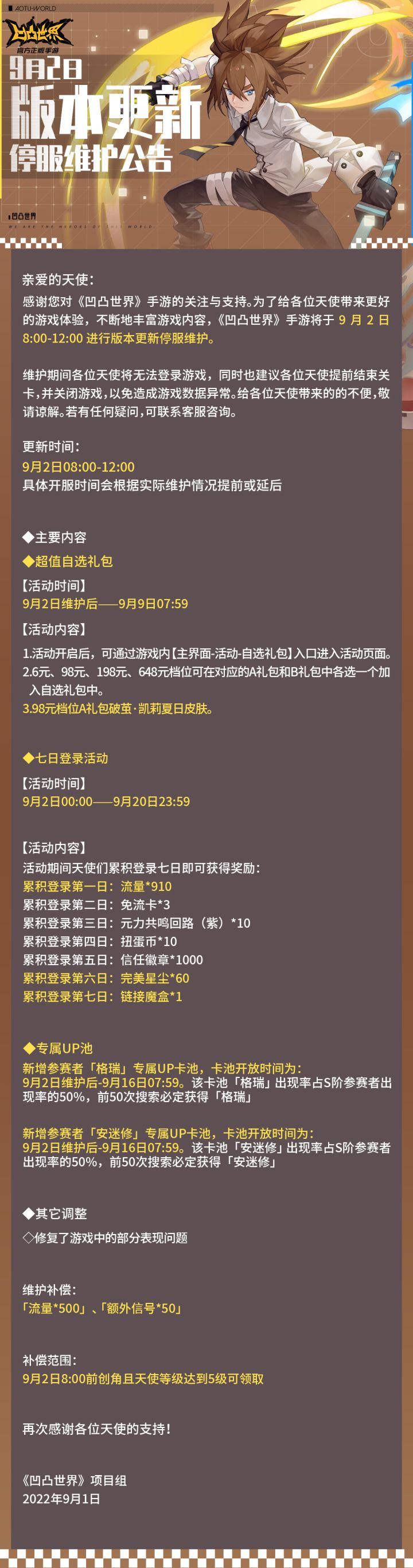 亲爱的天使:感谢您对《凹凸世界》手游的关注与支持。为了给各位天使带来更好的游戏体验,不断地丰富游戏内容,《凹凸世界》手游将于9月2日8:00-12:00进行版本更新停服维护。维护期间各位天使将无法登录游戏,同时也建议各位天使提前结束关卡,并关闭游戏,以免造成游戏数据异常。给各位天使带来的的不便,敬请谅解。若有任何疑问,可联系客服(QQ 800183691)咨询。
