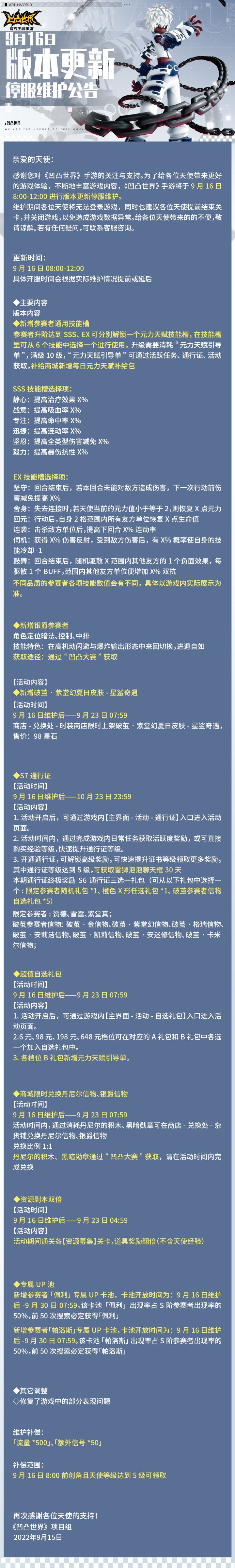 亲爱的天使:感谢您对《凹凸世界》手游的关注与支持。为了给各位天使带来更好的游戏体验,不断地丰富游戏内容,《凹凸世界》手游将于9月16日8:00-12:00进行版本更新停服维护。维护期间各位天使将无法登录游戏,同时也建议各位天使提前结束关卡,并关闭游戏,以免造成游戏数据异常。给各位天使带来的的不便,敬请谅解。若有任何疑问,可联系客服(QQ 800183691)咨询。