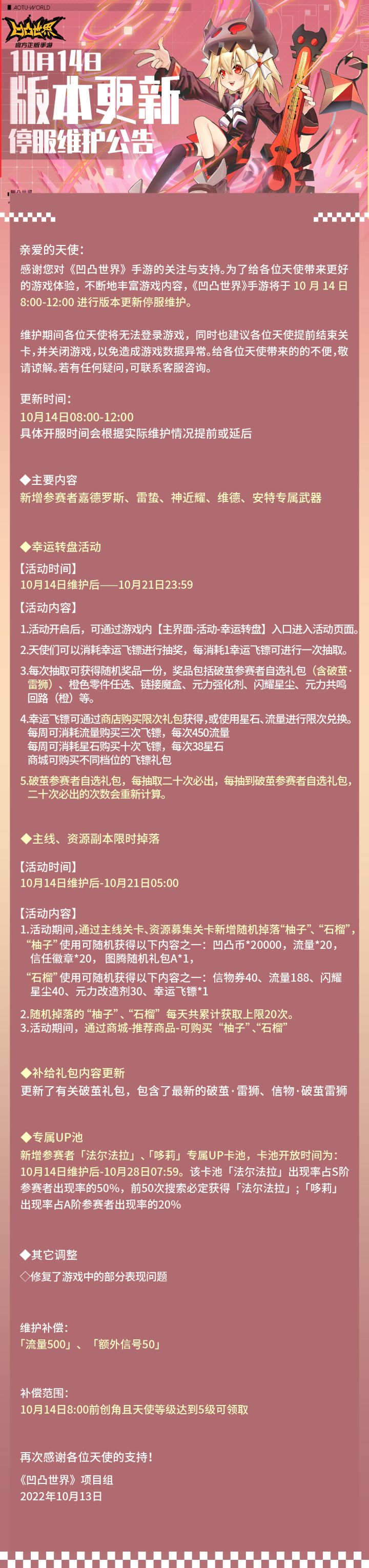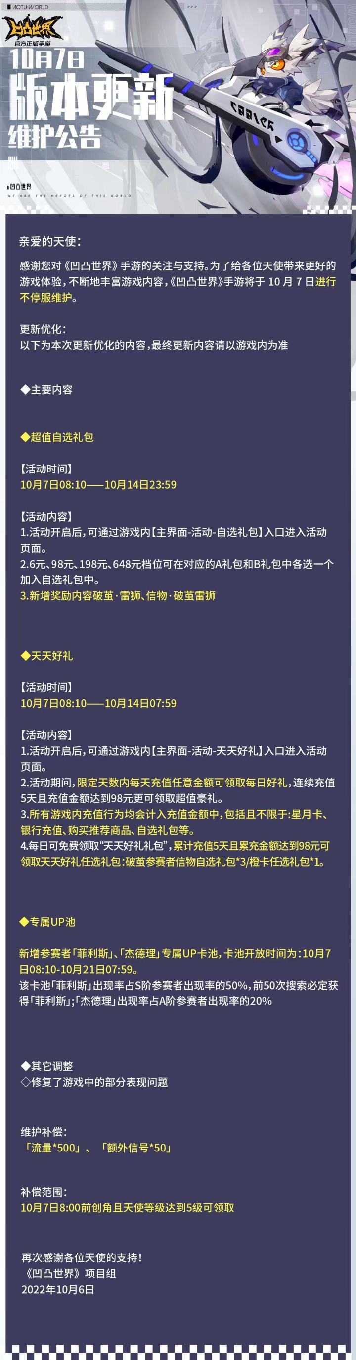 亲爱的天使:感谢您对《凹凸世界》手游的关注与支持。为了给各位天使带来更好的游戏体验,不断地丰富游戏内容,《凹凸世界》手游将于10月7日进行不停服维护。以下为本次更新优化的内容,最终更新内容请以游戏内为准。若有任何疑问,可联系客服(QQ 800183691)咨询。