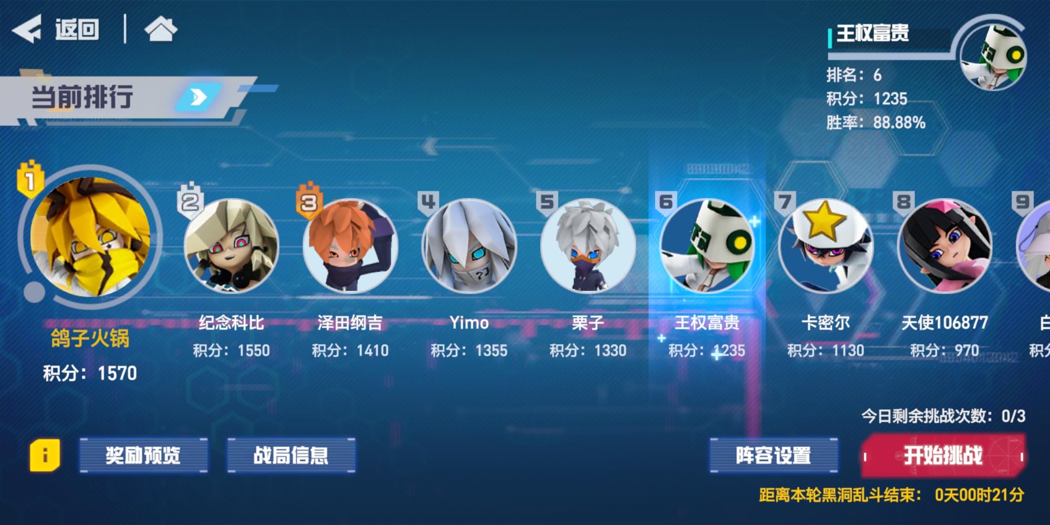 整个游戏确实有种没做完的感觉,不争的事实零零散散说一些建议1、改名卡20块是不是需要重新考虑一下,有点贵了,建议200流量,也不是什么很重要的东西,没必要在这个地方吸金,不讨好也赚不来啥钱2、黑洞随机性太大,全胜都可能被挤下去,第二周我280分,挤到了第五,就因为我没有被打。建议改改周期3、活动太少,这次更新说活动预热,哎,希望以后活动加快吧4、sss相比ss提升极少,有些玩家还说sss