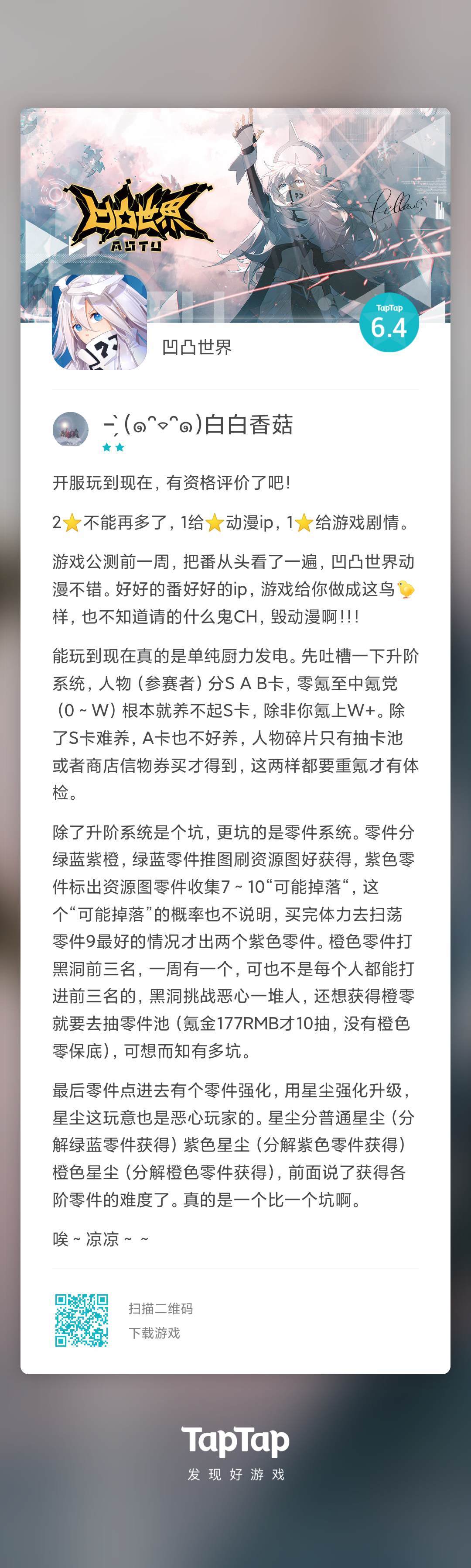 上周个人的凹凸账号被永久禁言了,当时因为临近考试而且也很少在地区聊天就没有急着处理,后来在tap上发帖求助,得到要加客服QQ询问的答复,然后前几天去问了凹凸客服,得到的答案是发布疑似广告信息内容,而且具体被禁内容也无法查看. 在这里首先说一下,我是一个学生党,而且近期各科结业在考试,所以很少有时间玩游戏,在地区都很少说话,而且这两天回忆了一下个人曾发言的内容;1、请问xx人物装什么零件比较好。2
