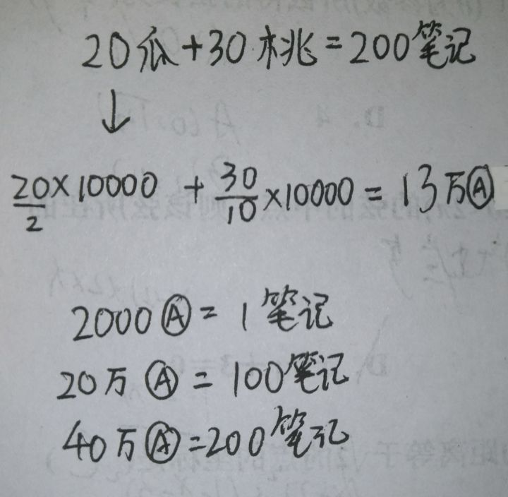 想必都看到了,20🍉+30🍑能换200笔记我们又知道,在商店有10本笔记,可以花20000凹凸币购买但是如果按照这个价格,200笔记要花40万凹凸币而很明显,比直接买笔记来说,不如先用🍉🍑换完再说(更划算)当然只限于想用凹凸币购买笔记的人,如果凹凸币很多的话,可以无视直接换笔记,管他呢(当然还是先把活动商店的换完划算)像我,钱不多,就选择换🍉🍑了,毕竟多余的🍉🍑还要留着换别的东西(比如紫